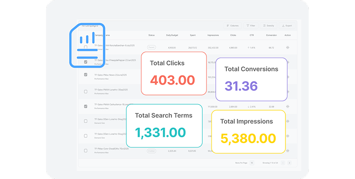 Fresh performance insights pulled directly from the Google Ads API — not stale cached data. Campaign comparisons, keyword research intelligence, search term mining, quality score distributions, and match type analysis. Anomaly detection flags sudden CPC spikes, CTR drops, and conversion rate changes before they become costly problems.
