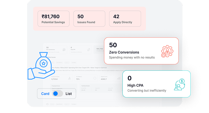Every morning, our AI curates 10 high-impact recommendations from across your entire account — ranked by financial impact, confidence, and effort. From pausing zero-conversion keywords to scaling your top performers, each card shows exactly what to change, why, and how much you stand to gain. Approve and execute directly, or dismiss with a click.