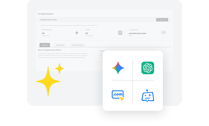 Track how your brand appears in AI-generated answers across ChatGPT, Gemini, and other LLMs. See which questions mention your domain, monitor AI visibility by keyword and geography, and stay ahead as search evolves.