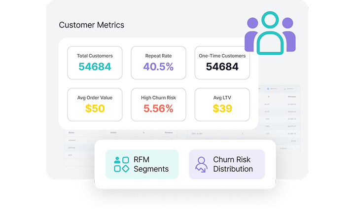 RFM segmentation, churn risk scoring, and lifetime value analysis so you can focus on your most profitable customers and re-engage those slipping away.