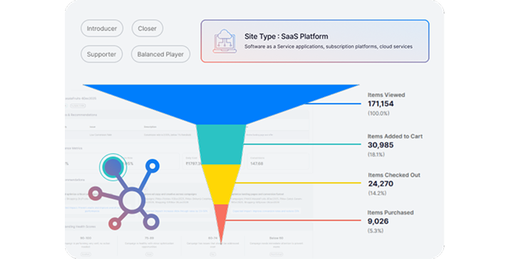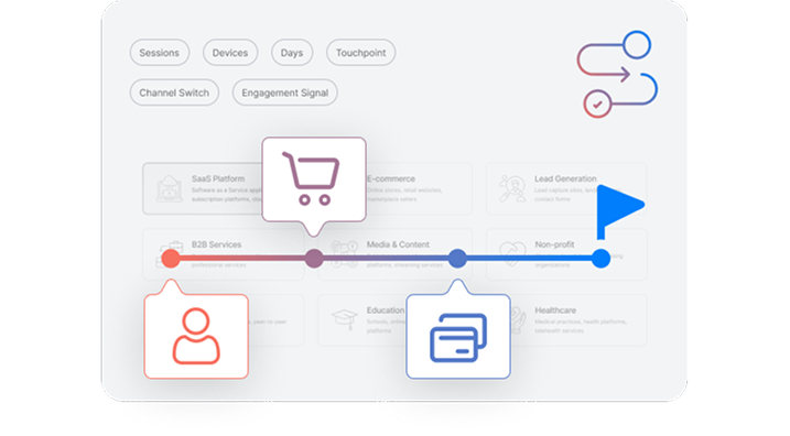 See the full picture of how customers find and buy from you. Pixel maps complete journeys across sessions, devices, and days — showing every touchpoint, channel switch, and engagement signal along the way. Identify where prospects drop off, which paths convert fastest, and how long your typical buyer takes to decide. Journey intelligence adapts to your business type — whether you're running an e-commerce store, a SaaS product, or a lead generation site.